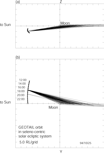 図1 1994年10月25日12:00-24:00のGEOTAILの軌道と磁力線。