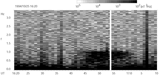 図2 1994年10月25日16:20−17:10にGEOTAIL衛星によって観測された磁場Bz成分のダイナミックスペクトル。